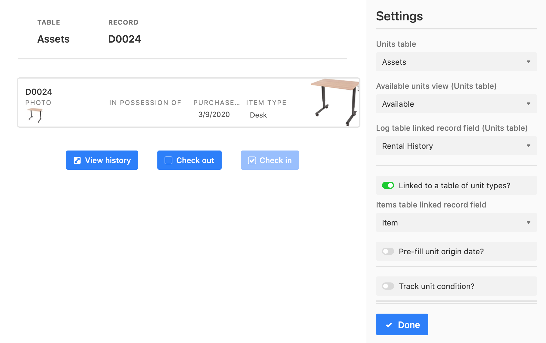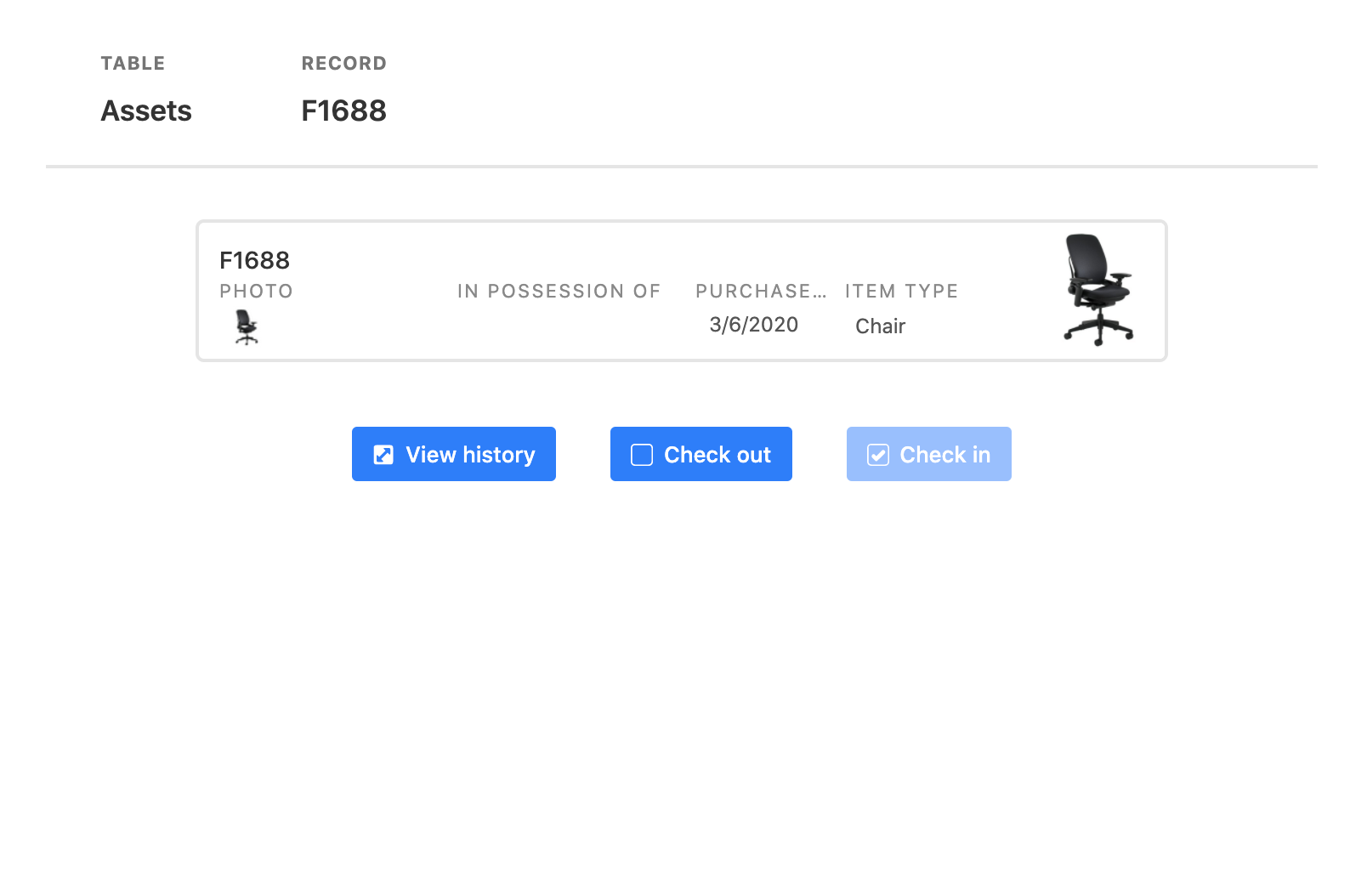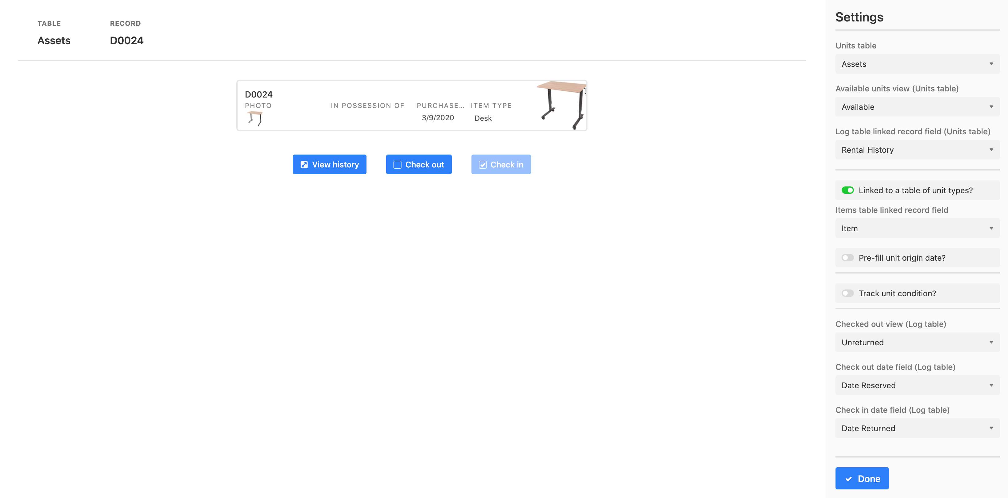 Manage an inventory? Rent out equipment? Need to track who comes in and out of a building? Manage when a record is "out" and "in" with ease using this custom extension! This extension is a customizable wizard which, in its most basic form, allows users to select a Unit record and create a new linked record in a Log table detailing when that record was "checked out" with relevant fields pre-filled to save time. The wizard just as easily allows users to check that unit back in to close out the log and make that unit available for selection once more. Advanced features include tracking a unit's condition over time (i.e. the unit was in "great" condition when it was checked out, but was in "poor" condition when it was checked back in), and the ability to enable an Items table for bases structured where each unit is an instance of a type of item.