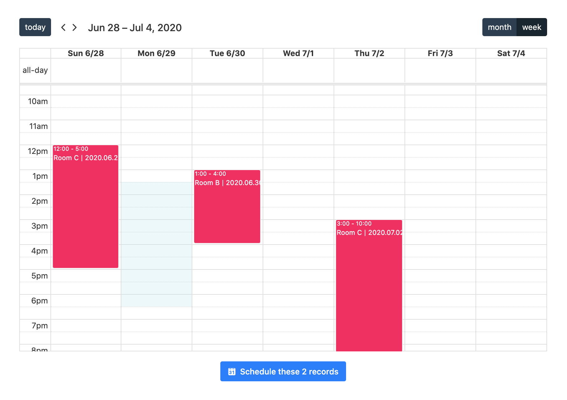 This custom extension allows users to schedule events, reservations, or appointments without double-booking any of the selected records in a simple, easy-to-use calendar interface! Users can select one or more records to display all of the related "schedule" records on a calendar interface. Users are then able to click and drag dates on the calendar to select a start and end time, but only if that day/time slot is unoccupied by an existing record. Once dates are selected, a new scheduled record is added to the calendar and is opened in Airtable's expanded record modal to allow users to quickly fill in the remaining fields.